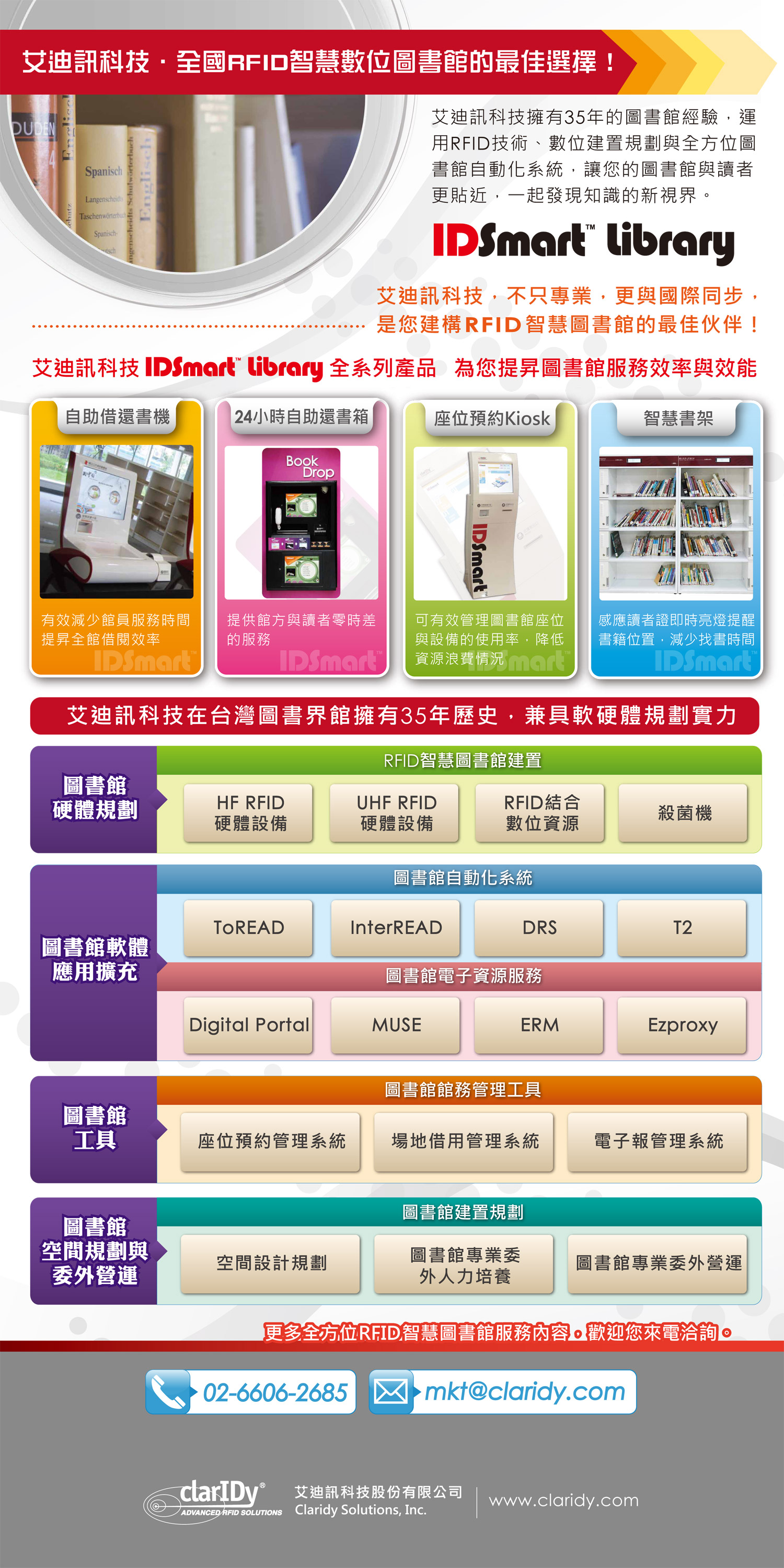 主要產品:擁有35年的圖書館經驗,運用RFID技術、數位建置規劃與全方位圖書館自動化系統,讓您的圖書館與讀者更貼近,一起發現知識的新視界。主要產品與服務有: