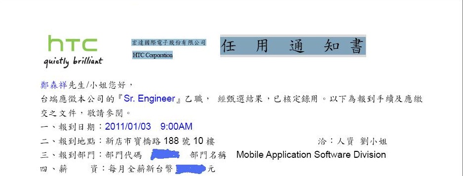 恭賀艾鍗學員-鄭森祥錄取宏達電Sr. Engineer工程師乙職