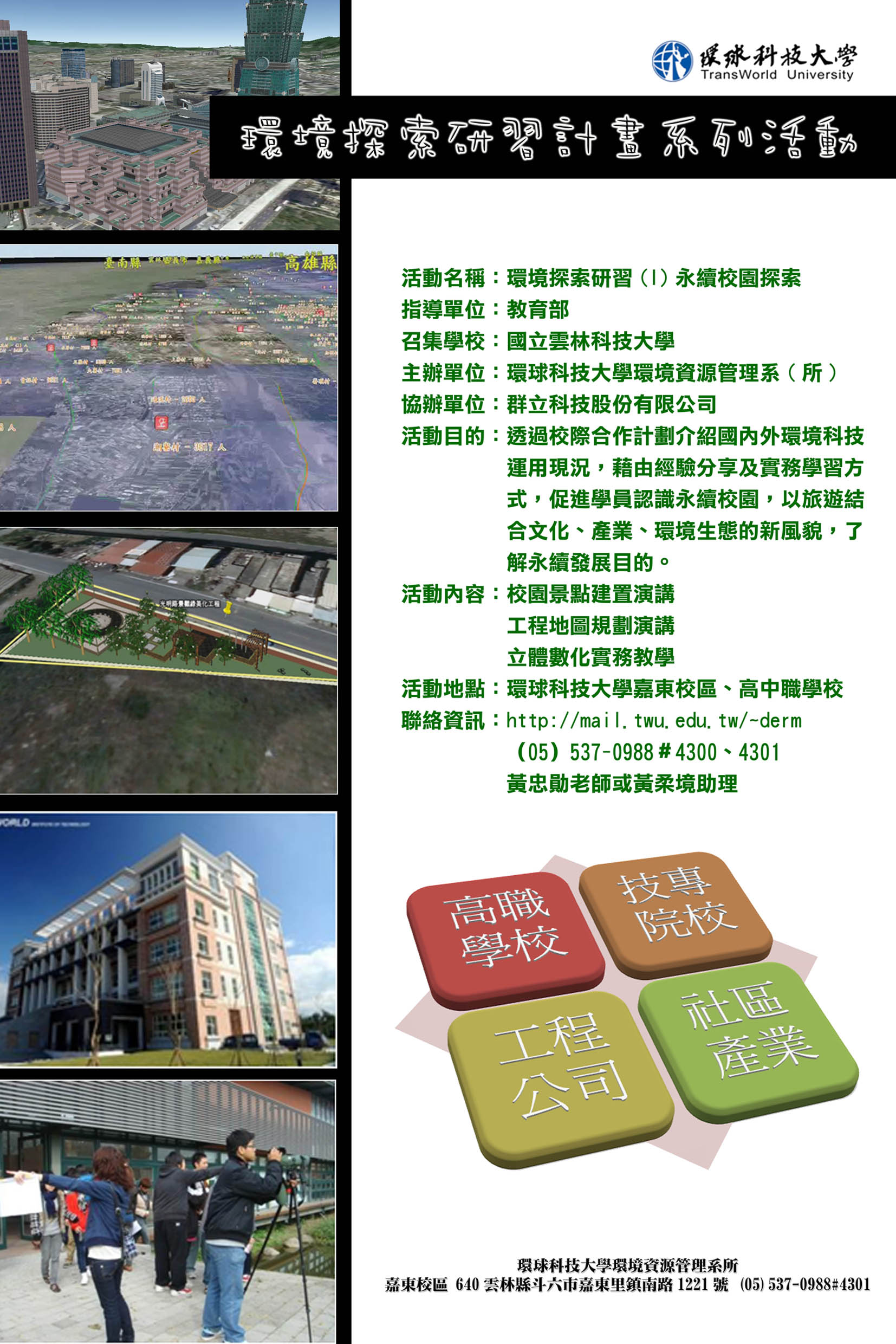 活動目的:透過校際合作計劃介紹國內外環境科技運用現況, 藉由經驗分享及實務學習方式,