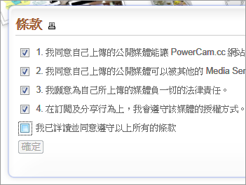 1. 第一次登入,會請使用者勾選條款 (如下圖),勾選完畢就會出現確定的按鈕