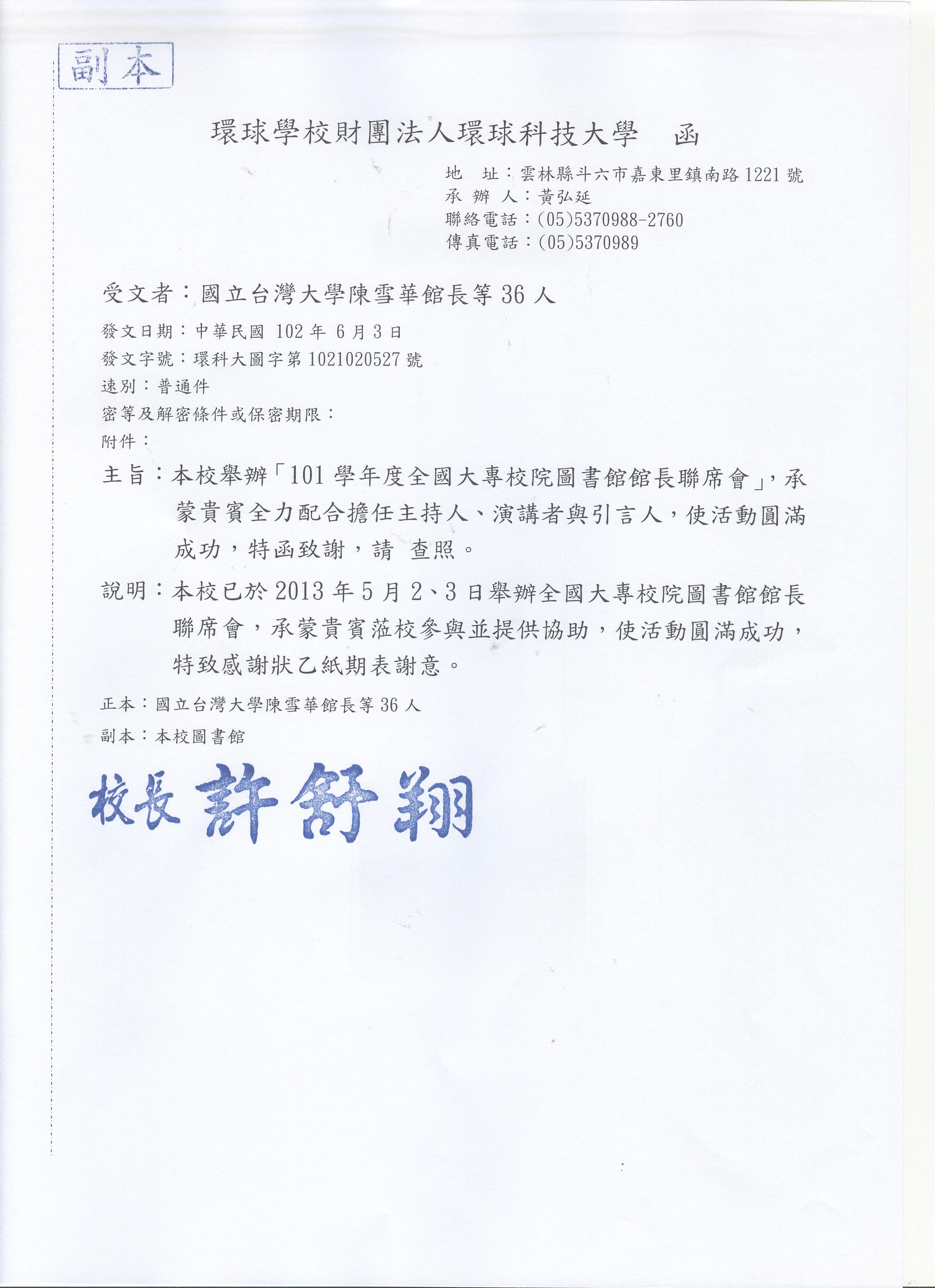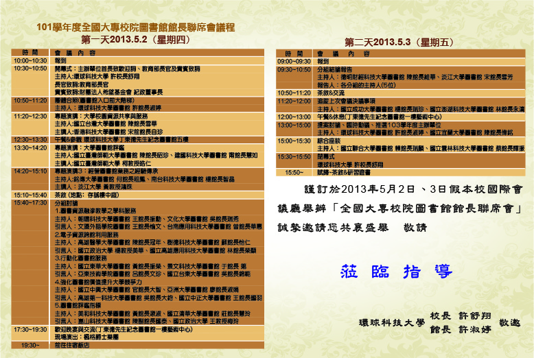 感謝您對環球科技大學的支持,一年一度的全國大學圖書館館長聯席會將於 102 年 5 月 2、3 日(星期四、五)舉行,本圖書館誠摯的歡迎與期盼各位館長参加。