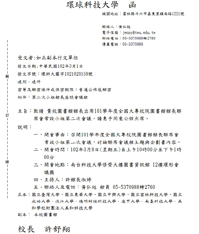1. 全國大專校院圖書館館長聯席會常設小組籌備會議20130308 , 於南台科技大學圖書館., 開會通知電子公文已到校 2. 為協助此會及接待遠到而來之委員, 本館同仁分組如下: (1) 場地設備組: 備妥會議場地之設備及清潔工作 (2) 議事導覽組: 可協助會議資料之列印, 會後參觀南台科技大學圖書館之導覽工作 (3) 餐飲交通組: 將協助代訂便當, 交通接送之服務 3. 請即早告知與會人員之交通接送, 目前我們規劃以館員借用校車接送台南高鐵站, 台鐵火車站部份若有需求, 我們將再想辦法 4. 歡迎各位常設小組委員蒞臨本館 ! 南台科技大學圖書館 楊智晶館長 敬啟 ccyang@mail.stust.edu.tw